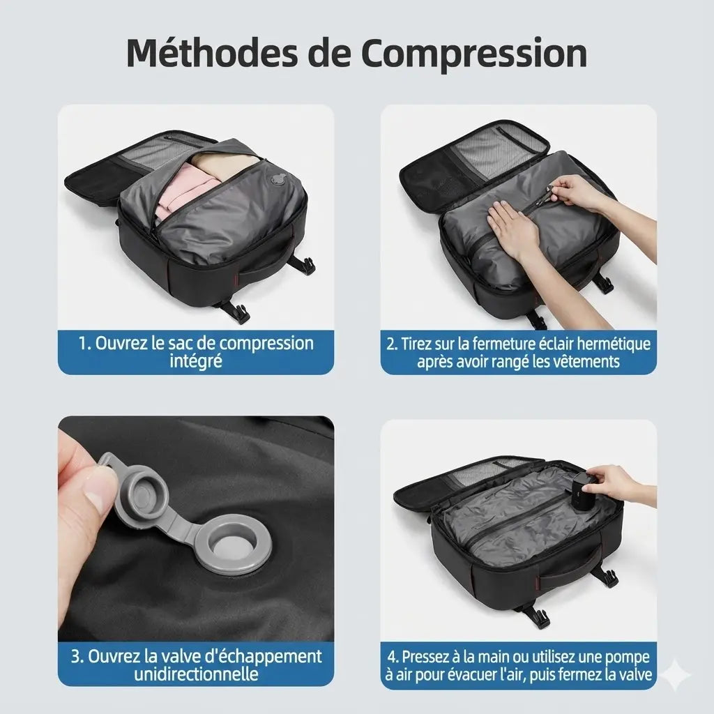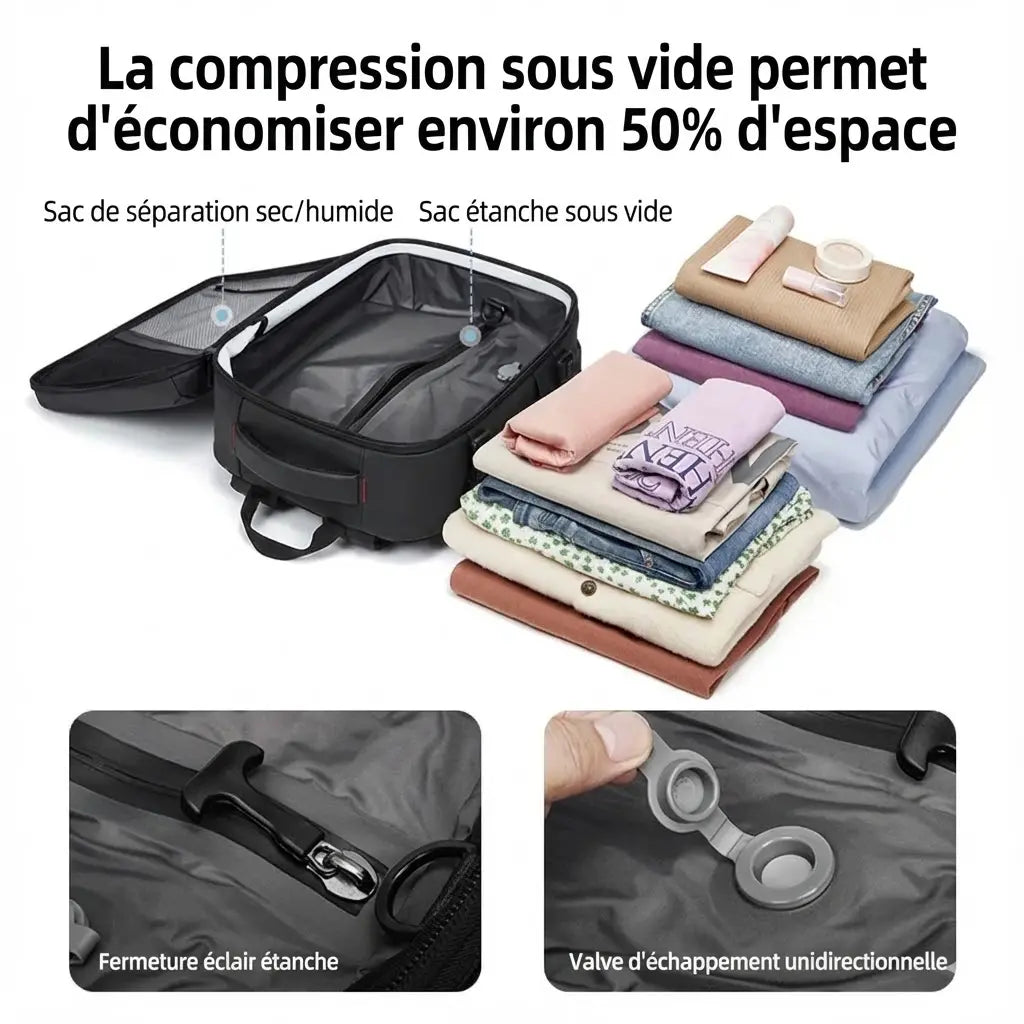 Ne choisissez plus entre vos affaires et votre mobilité. Grâce au système de compression sous vide intégré, ce sac réduit le volume de vos vêtements de 50%, vous permettant de voyager léger sans rien laisser derrière.