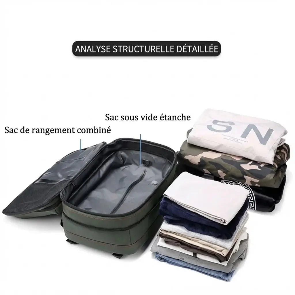 Emportez deux fois plus de vêtements grâce au système de compression intégré. Expulsez simplement l'air manuellement pour réduire le volume de vos affaires de 50% sans utiliser d'aspirateur.